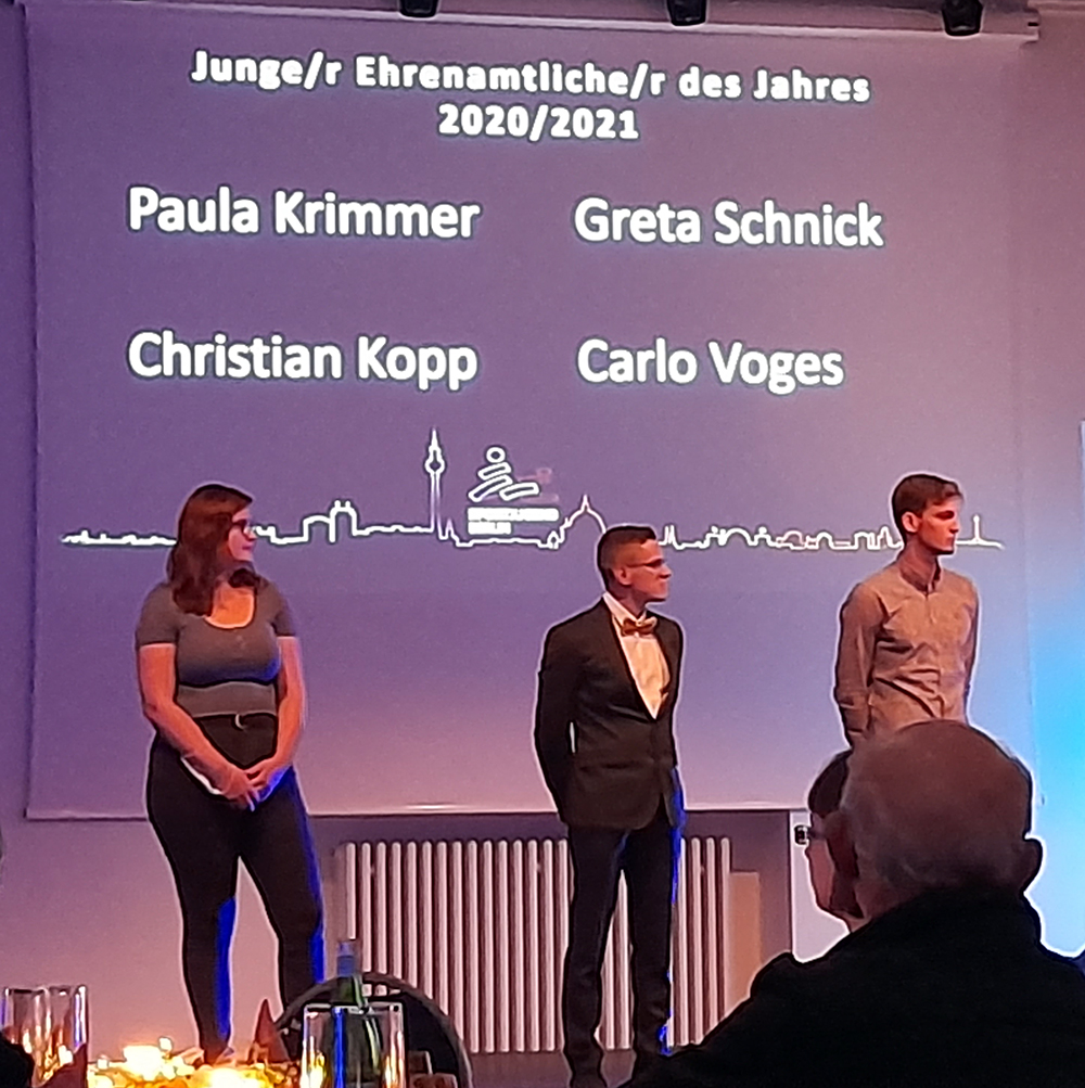 In den Räumen des Landessportbundes Berlin fand am 12.11.2021 in einer feierlichen Atmosphäre die Ehrung - Junge Ehrenamtliche 2021 - durch die Sportjugend Berlin statt. Aus den Reihen des SV Berolina e.V. wurde Paula Krimmer für ihre langjährige ehrenamtliche Arbeit ausgezeichnet. Wir sagen Danke liebe Paula für deine Arbeit mit den Seepferdchenkindern und freuen uns auf eine weitere Zusammenarbeit mit Dir.